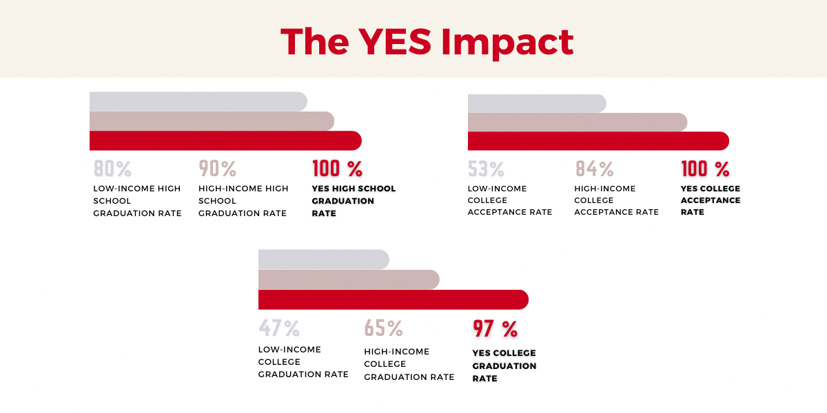 From neighborhoods where fewer than 10% of adults have a college degree, every year 100% of YES Scholars graduate from high school and are accepted to college. More significantly, YES Scholars have a 97% college graduation rate.